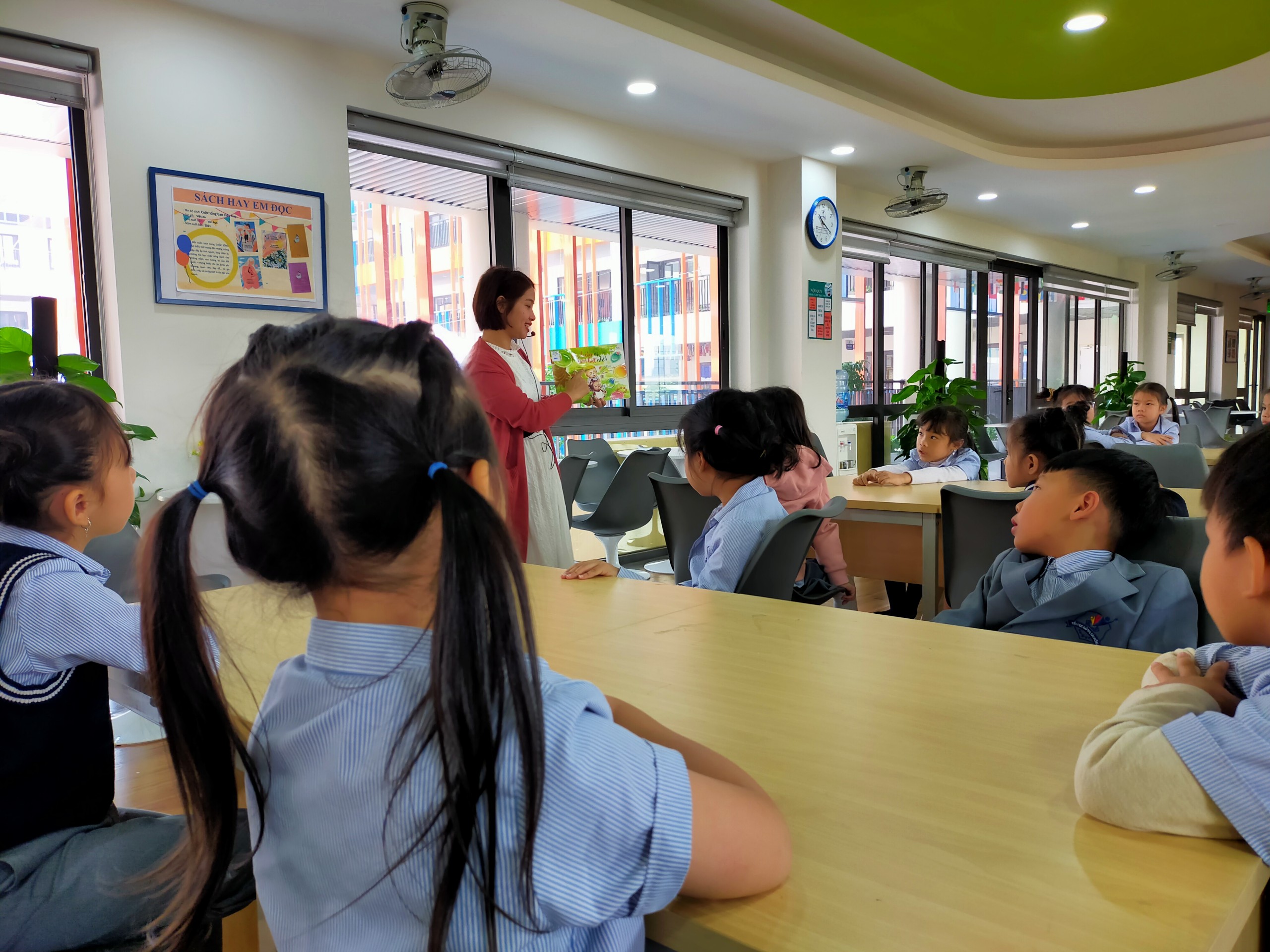 Hình thức Đọc to- nghe chung được cô Ngọc La sử dụng đối với tiết đọc theo chủ điểm dành cho học sinh khối Một. Không chỉ được nghe cô giáo, các bạn đọc; các con học sinh còn được tương tác với giáo viên thông qua nhiều câu hỏi tìm hiểu về cuốn sách. Thông qua đó, hiệu quả của tiết đọc được nâng cao.